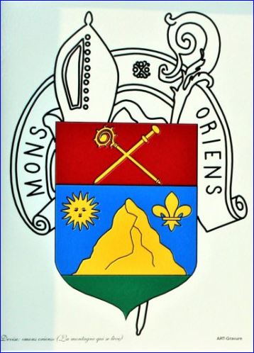 D'azur à la montagne de six coupeaux d'or posée sur une terrasse voûtée de sinople et accompagnée à dextre d'un soleil d'or et à senestre d'une fleur de lis du même; au chef cousu de gueules chargé d'une crosse d'or et d'un bourdon du même, passés en sautoir.