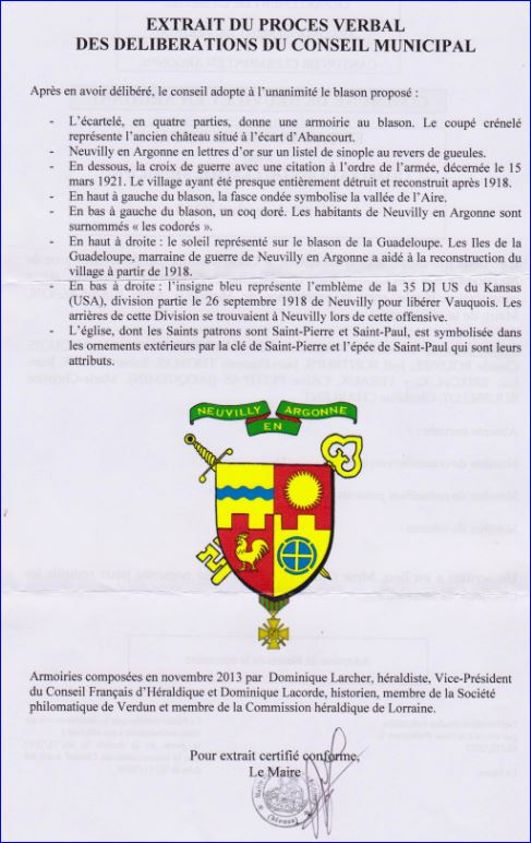 (2013) Écartelé, la ligne du coupé crénelée de trois merlons: au 1er d'or à la fasce ondée d'azur, au 2e de gueules au soleil non figuré de trente-deux rais d'or [soleil des armes de la Guadeloupe], au 3e de gueules au coq d'or, au 4e d'or au tourteau d'azur éclaté en croix et enfermé dans un annelet du même éclaté en sautoir [insigne de la 35e Division d'Infanterie US].