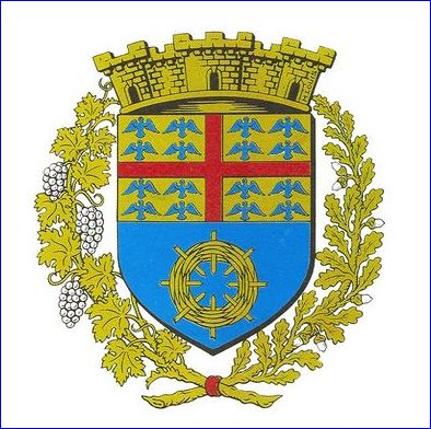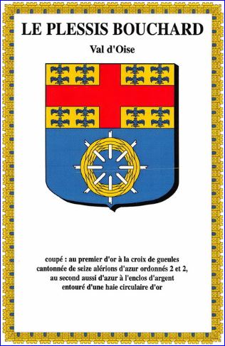 Coupé: au 1er d'or à la croix de gueules cantonnée de seize alérions d'azur quatre dans chaque canton, au 2e d'azur à l'enclos entouré d'une haie circulaire d'or.