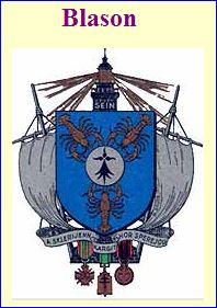 (1953) D'azur au besant d'argent chargé d'une moucheture d'hermine de sable, accompagné de trois homards d'or appointés en pairle.