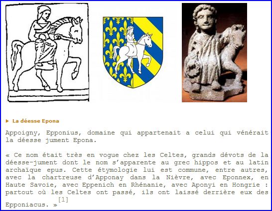 Parti: au 1er d'azur semé de fleurs de lis d'or, au 2e bandé d'azur et d'or; à la déesse Epona assise en majesté sur une jument passante d'argent, contournée et brochant sur le tout.