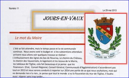 (2013) Tranché ondé: au 1er de gueules à la tête de boeuf coupée d'argent, au 2e d'azur à la tour d'argent ouverte, ajourée et maçonnée de sable; à la bande ondée d'or chargée de trois canettes de sinople posées à plomb, brochant sur la partition.