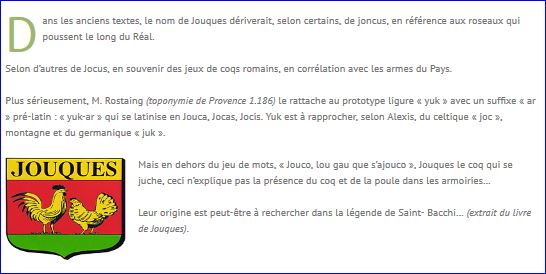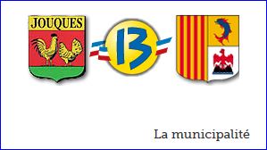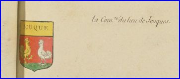De gueules au coq contourné d'or, crêté et barbé de sable, senestré d'une poule du même sur une terrasse cousue de sinople; au chef d'or chargé de l'inscription « JOUQUES » en lettres capitales de sable