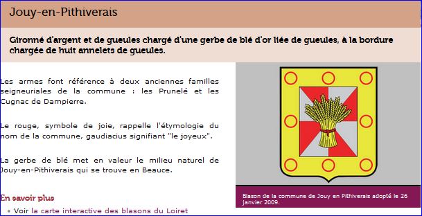 Gironné de gueules et d'argent, à la gerbe de blé d'or liée de gueules brochante; le tout enfermé dans une bordure d'or chargée de huit annelets de gueules.