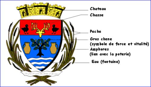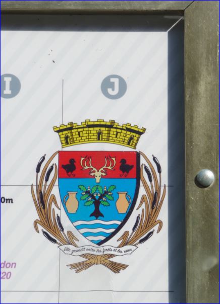 D'azur au chêne de sinople, englanté d'or, fûté de sable, accosté de deux pots antiques au naturel, soutenu d'une tierce ondée d'argent; au chef cousu de gueules chargé d'un rencontre de cerf d'or brochant en partie sur la partition, accosté de deux poules d'eau affrontées de sable, allumées d'argent et membrées d'or.