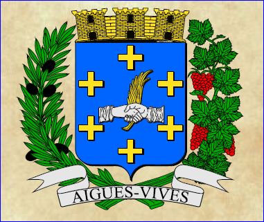 D'azur à la foi alésée et abaissée d'argent, tenant une palme d'or en pal, accompagnée de six croisettes du même, ordonnées en orle 1, 2, 2 et 1.