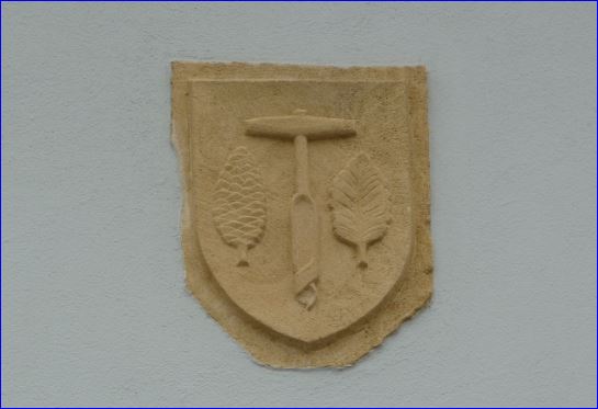 De gueules à la tarière d'argent posée en pal, la pointe en bas, adextrée d'une pomme de pin d'or et senestrée d'une feuille de hêtre du même.