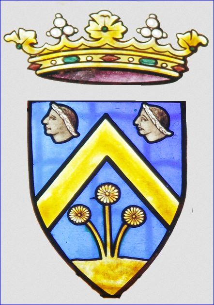 D'azur au chevron d'or accompagné en chef de deux têtes de Maure de sable liées d'argent et en pointe de trois pâquerettes tigées mal ordonnées, en bande, pal et barre, mouvant d'une terrasse, le tout d'or.