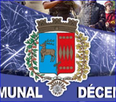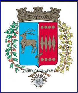 (1986) Parti: au 1er d'azur au cerf arrêté d'or, au 2e de gueules à quatre fusées accolées en fasce d'or et accompagnées de huit besants du même, quatre rangés en chef et quatre rangés en pointe; à l'épée haute d'argent, garnie d'or brochant sur la partition.