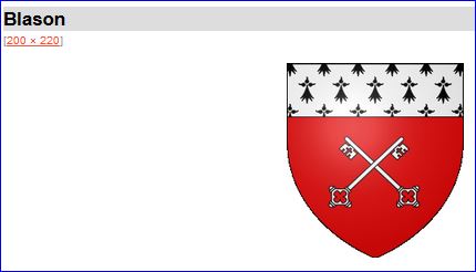 De gueules à deux clefs d'argent passées en sautoir; au chef d'hermine.