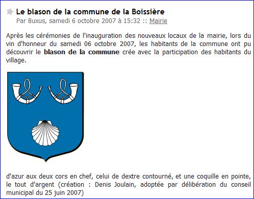 (2007) D'azur à deux huchets d'argent en chef, celui de dextre contourné, et une coquille du même en pointe.