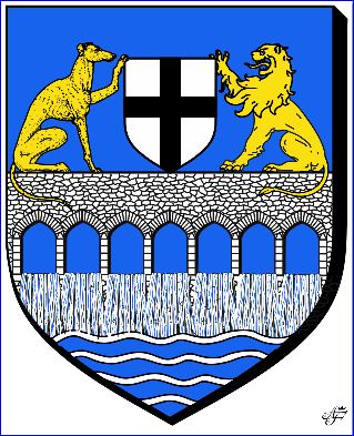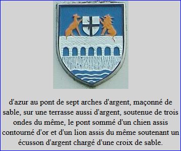 D'azur au pont de sept arches d'argent, maçonné de sable, mouvant des flancs, sur une terrasse d'argent et accompagné en pointe d'une tierce ondée du même, le pont sommé d'un chien assis contourné affronté à un lion assis, tous deux d'or, soutenant un écusson d'argent à la croix de sable.