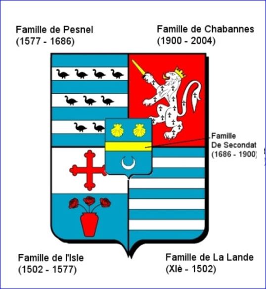 (1982) Écartelé: au 1er d'azur à trois fasces d'argent chargées respectivement de quatre, trois et deux merlettes de sable, au 2e de gueules au lion d'hermine couronné d'or et brandissant une épée du même posée en bande, au 3e coupé au I d'argent à la croix tréflée de gueules, au II d'azur au vase de gueules garni d'un bouquet de trois fleurs du même, au 4e d'azur à quatre fasces d'argent; sur le tout, d'azur à la fasce d'or accompagnée en chef de deux coquilles du même et en pointe d'un croissant d'argent.
