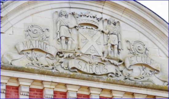 Au début du XXe siècle, la commune recevait un don de Rodman Wanamaker (1863-1928), un riche homme d'affaire américain dont le beau-père était originaire de Sarcus. Ce don servit à construire, en 1907, une somptueuse mairie-école. A cette occasion, la commune se choisit un blason; elle releva à l'identique les armes de la famille De Sarcus, dont elle adopta même les ornements extérieurs: anges et couronne. Ces grandes armes figurent sur l'imposant fronton de cette construction de brique et pierre. Elles figuraient aussi, lors de l'inauguration de 1910, sur la bannière de la société chorale de Sarcus.