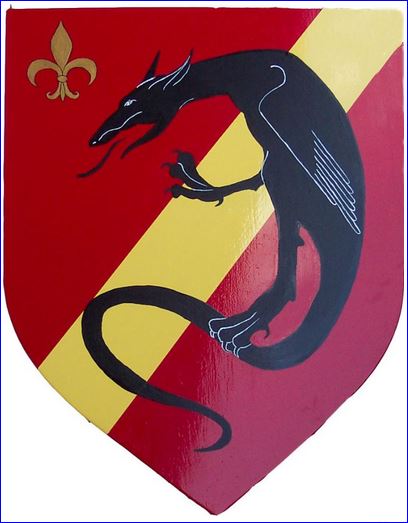 De gueules à la barre d'or accompagnée en chef dextre d'une fleur de lis du même; au dragon rampant de sable brochant sur le tout.