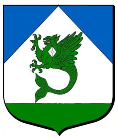 (2013) D'argent au griffon mariné de sinople portant à l'épaule un diamant taillé en losange du champ; chaperonné d'azur et terrassé de sinople.