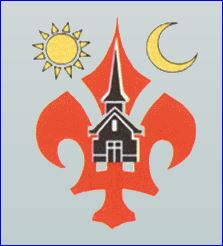 (1979) D'argent à la fleur de lis de gueules chargée d'une chapelle de sable accompagnée en chef à dextre d'un soleil d'or et à senestre d'un croissant contourné du même.