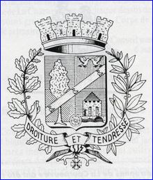 C’est M. Mathieu, architecte municipal qui fut chargé de composer le blason, sur la demande du maire, Philippe Roux. Si ces armoiries ne respectent pas les règles de l’art héraldique, elles symbolisent cependant assez parfaitement l’histoire de la ville.
