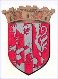 De gueules à deux pals d'argent, au lion brochant de l'un en l'autre.