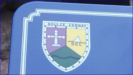 (2014) Tiercé en pairle renversé: au 1er de pourpre à la croix de cimetière du lieu, pommetée, perronnée de deux pièces et chargée en coeur d'un besant surchargé d'un coeur, le tout d'argent, au 2e d'or au tas de sel d'argent soutenu de l'inscription "SEL" de sable, au 3e de sinople à la divise ondée cousue d'azur; le tout enfermé dans une bordure réduite d'argent chargée de vingt grènetis de sable.