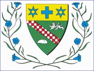 (2003) De sinople à la bande échiquetée d'argent et de gueules de deux tires, accompagnée, en chef, d'un lion léopardé d'argent et, en pointe, d'une motte féodale du même; au chef d'or chargé d'une croisette d'azur accostée de deux molettes d'éperon du même.
