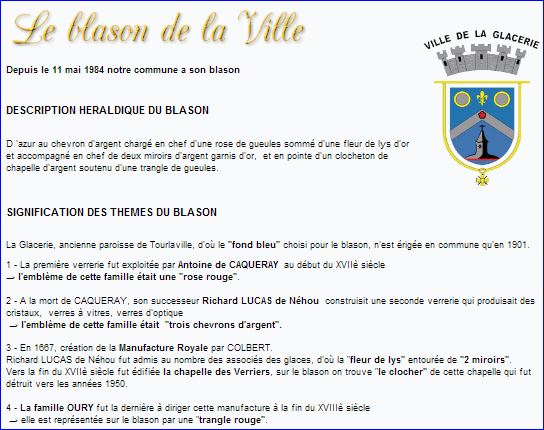 (1984) D'azur au chevron d'argent, chargé en chef d'une rose de gueules, sommé d'une fleur de lis d'or, accompagné en chef de deux miroirs d'argent cerclés d'or, et en pointe d'un clocheton de chapelle d'argent posée sur une trangle de gueules.