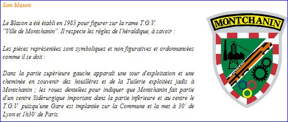 (1983) De sinople à la barre d'argent chargée d'un TGV d'orangé et de sable mouvant de la pointe et dans le sens de la barre, accompagnée en chef d'un chevalet de mine de sable, mouvant de la barre et brochant sur une usine du même et en pointe de deux roues d'engrenage de sable, engrenées en barre et soutenues de trois anneaux accolés, 2 et 1, d'azur, de gueules et d'or; le tout enfermé dans une bordure componée de vingt-deux pièces d'argent et de gueules.