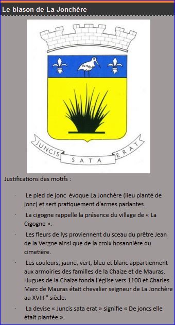 D'or au pied de jonc de sinople; au chef d'azur chargé d'une cigogne contournée d'argent, becquée et membrée de sable, issant du trait du chef, accostée de deux fleurs de lis d'argent.