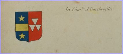 Parti: au 1er d'azur à la fasce d'or accompagnée de deux étoiles du même, au 2e de gueules à trois triangles renversés d'argent mal ordonnés.