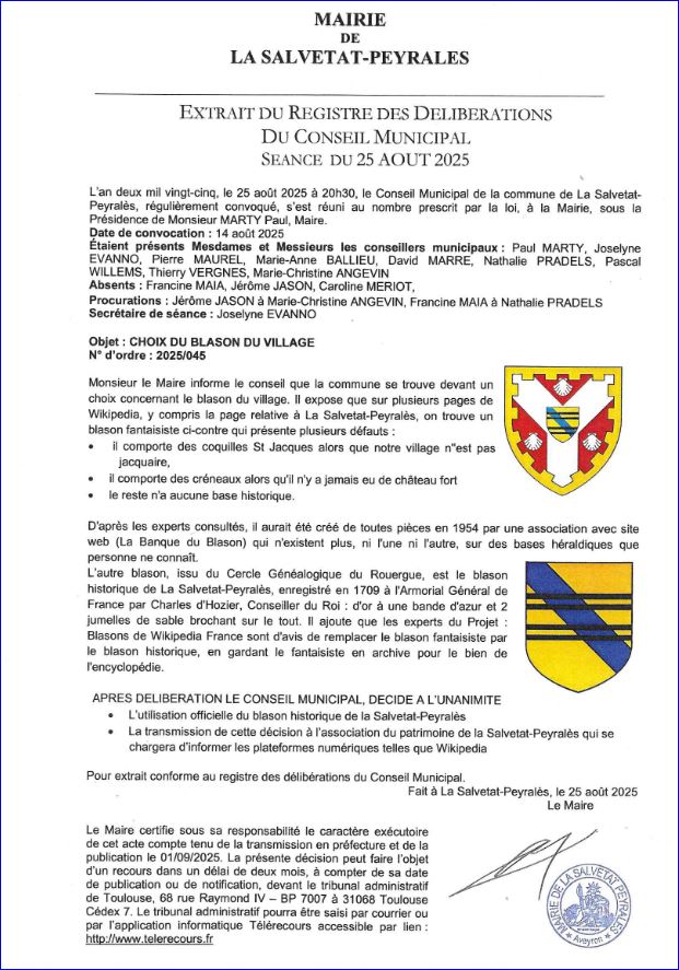 Extrait du registre des délibérations du Conseil Municipal du 25 août 2025, confirmant le blason historique.