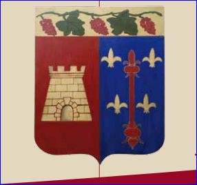 (1991) Parti: au 1er de gueules à la tour d'or maçonnée de sable, au 2e d'azur au sceptre de gueules, accosté de quatre fleurs de lis d'or; le tout sommé d'un comble d'or chargé d'un pampre de vigne au naturel fruité de trois pièces, posé en fasce.