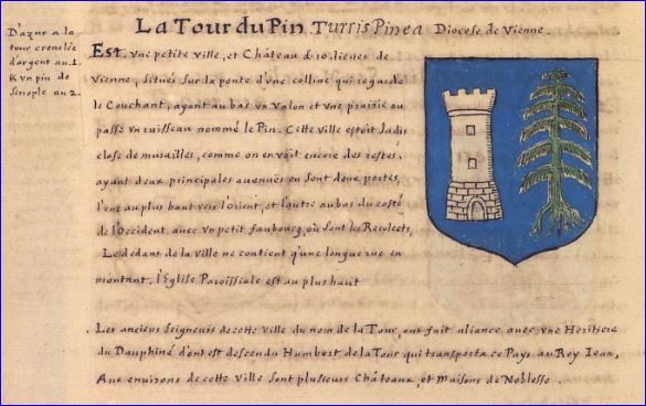 Parti au 1er d'azur à la tour d'argent, maçonnée de sable, ouverte du champ, au 2e d'argent au pin de sinople.