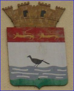 D'argent au merle de sable becqué d'or sur une rivière d'azur agitée du champ et posée sur une plaine ondée de sinople; au chef de gueules chargé de deux léopards d'or.