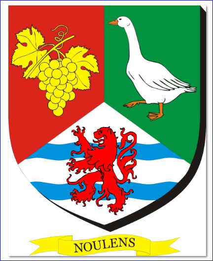 (2015) Tiercé en pairle renversé: au 1er de gueules à la grappe de raisin d'or tigée et feuillée de deux pièces de même, au 2e de sinople à l'oie au naturel, au 3e d'argent à deux fasces ondées d'azur et au lion de gueules brochant.