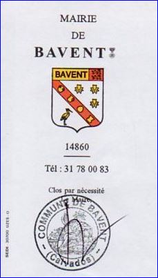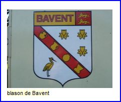 D'argent à la cotice de gueules chargée de quatre poteries de Bavent d'or (un pot à deux anses, un broc, un vase et un pot à col évasé) posées en barre, et accompagnée en chef de trois fleurs de jonquilles d'or ordonnées en orle et en pointe d'un héron contourné du même becqué et membré de sable; au chef d'or chargé de l'inscription en capitales de sable BAVENT senestré de gueules chargé de deux léopards d'or l'un au-dessus de l'autre.