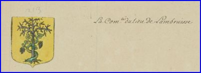 D'or au cep de vigne de sinople, fruité de sable, accolé à un arbre sec arraché du même.