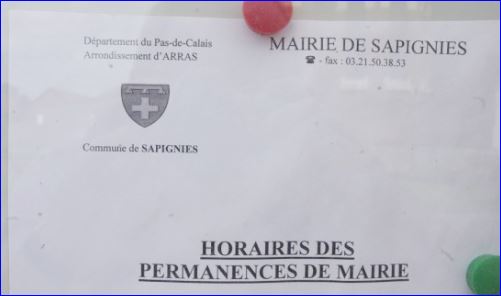 La famille de Sapignies portait, selon certains auteurs, une croix denchée, ou dentelée [ou endentée], pour d'autres une croix engrêlée, mais jamais cette croix ne fut alésée (séparée des bords de l'écu), comme le montrent les armes de la commune de Sapignies, telles que les ont suggérées à la commune, qui les a adoptées, les Archives du Pas-de-Calais en 1994