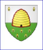 D'argent à la ruche d'or, bordée de gueules, ouverte de sable, sur une terrasse de sinople chargée de cinq abeilles au naturel, accompagnée en chef de deux abeilles du même.