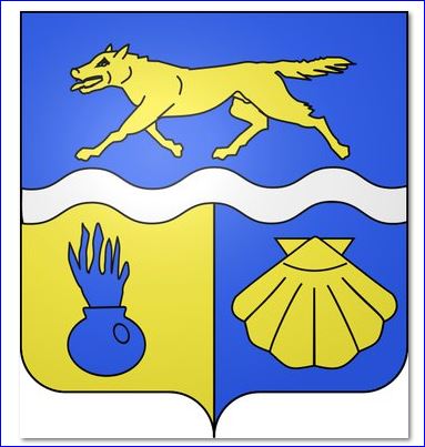 Coupé: au 1er d'azur au loup d'or, au 2e parti d'or à la grenade de guerre d'azur et d'azur à la coquille d'or; à la devise ondée d'argent brochant sur le coupé.