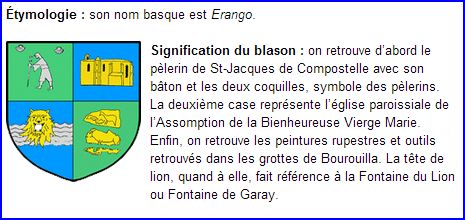 (2002) Écartelé: au 1er de sinople au pèlerin d'argent marchant de profil tenant de la main senestre un bourdon de sable, cantonné en chef de deux coquilles d'argent, au 2e d'azur à l'église de profil d'or, sommée à dextre d'un clocheton croiseté du même, couverte au naturel et ajourée de sable, au 3e d'azur à la rivière ondée d'argent et au masque de léopard d'or brochant, au 4e de sinople à trois gravures préhistoriques représentant des animaux d'or, sans forme et rangés en pal.