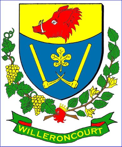 (2014) D'azur à la feuille de figuier d'or accostée de deux pics de mineur versés du même, celui de dextre en bande, celui de senestre en barre, leurs fers passés en sautoir; au chef ployé d'or chargé d'une hure de sanglier de gueules, défendue et allumée d'argent.