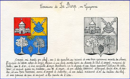 (1989) Coupé: au 1er parti au I de gueules au prieuré à une tour gasconne couverte et pavillonnée d'argent ouverte du champ, flanquée de deux corps de logis d'argent, chacun à une porte ouverte du champ, au II d'or à la coquille d'azur brochant sur deux bâtons de pèlerin d'argent passés en sautoir, au 2e d'azur au chêne terrassé d'argent à dextre et au pin terrassé d'argent à senestre, accompagnés en chef d'un soleil d'or mouvant du trait du coupé. et en pointe d'une pomme de pin d'argent.