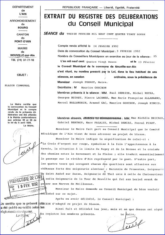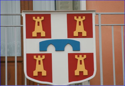(1992) De gueules à la croix d'argent chargée en coeur d'un pont de deux arches d'azur, cantonnée de quatre tours d'or ouvertes et ajourées du champ, maçonnées de sable.