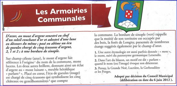 (2012) D'azur au mont d'argent accompagné en chef dextre d'une lune en décours d'or, en chef senestre d'un soleil couchant du même et en abîme d'un écusson cousu de gueules chargé de cinq écussons d'argent; à la bordure cousue de sinople.