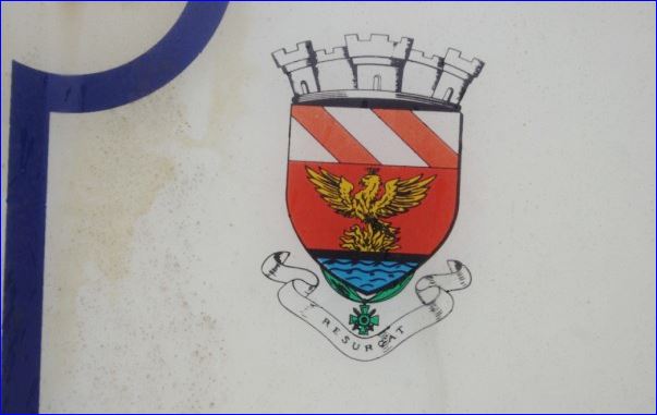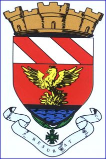 (1950) De gueules au phénix sur son immortalité d'or, mouvant d'une devise de sable elle-même posée sur une mer d'azur; au chef d'argent à deux bandes de gueules.