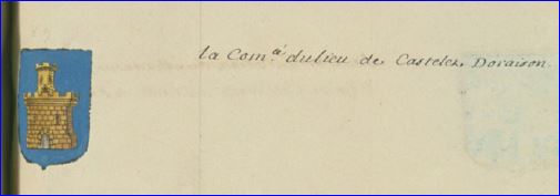 D'azur au château donjonné d'or, maçonné de sable, fermé d'une porte d'argent.
