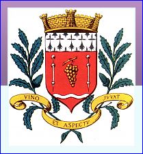 (1955) De gueules à la grappe de raisin d'or, accostée de deux bourdons de pèlerin d'argent et soutenue d'une divise ondée du même; au chef d'hermine.