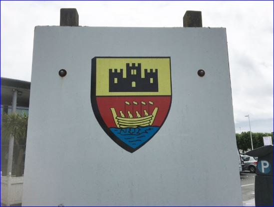 Coupé: au 1er d'or au château de sable, ouvert et ajouré d'argent, au 2e de gueules à la barque d'or montée de quatre personnages contournés chacun tenant une lance à guidon du même, voguant sur une onde d'azur.
