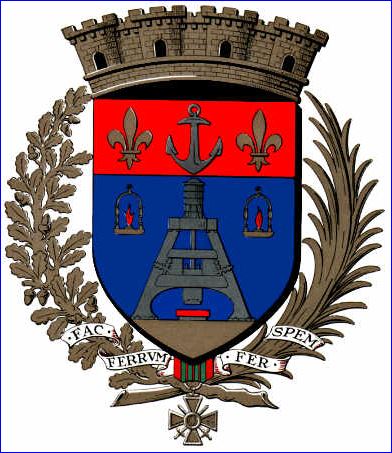 (1950) D'azur au marteau-pilon d'argent posé sur une terrasse d'or, l'enclume sommée d'un lingot de gueules, accosté en chef de deux lampes anciennes de mineur d'or allumées de gueules; au chef cousu de gueules chargé d'une ancre d'argent accostée de deux fleurs de lis d'or.