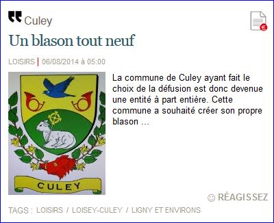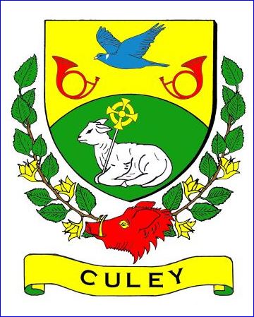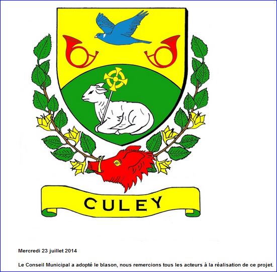 (2014) Coupé voûté: au 1er d'or à la palombe d'azur, becquée et au col d'argent, volant en fasce, soutenue par deux cors de chasse de gueules, celui à dextre contourné, au 2e de sinople à l'agneau couché d'argent, tenant une hampe d'or ornée d'une croix celtique.